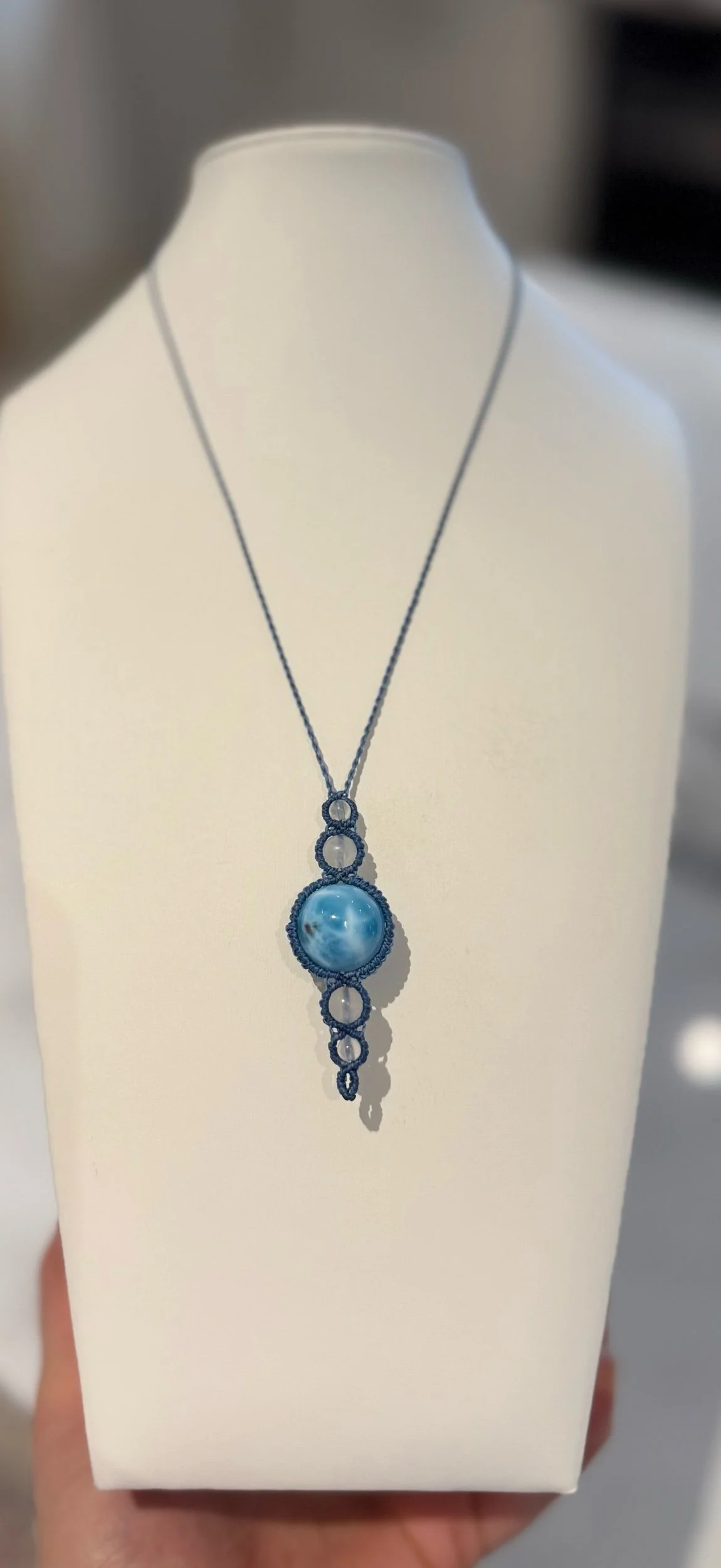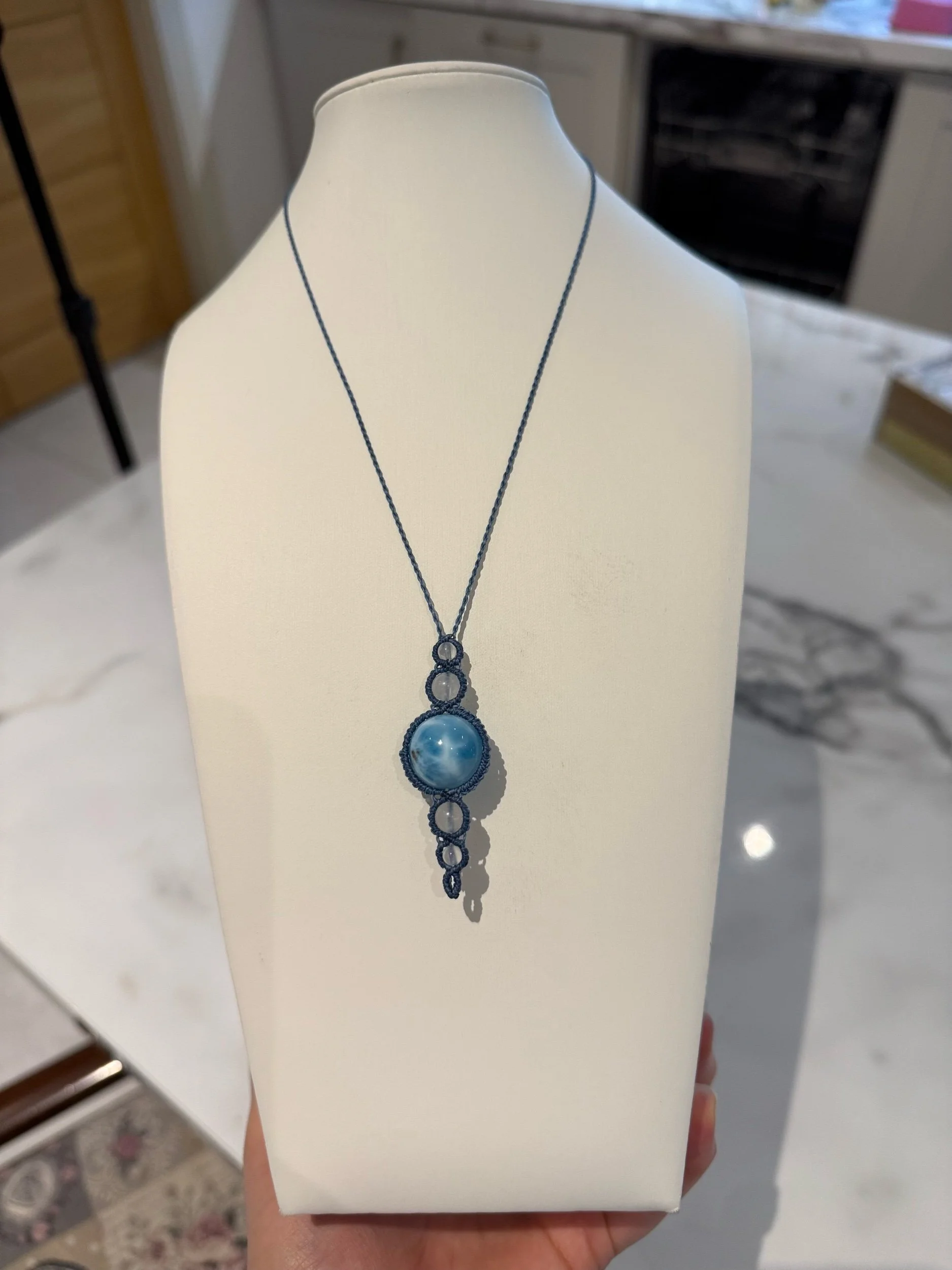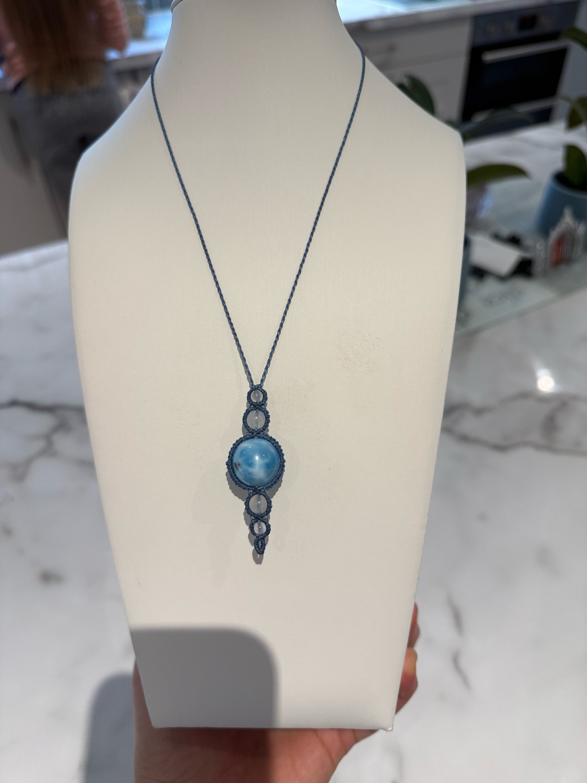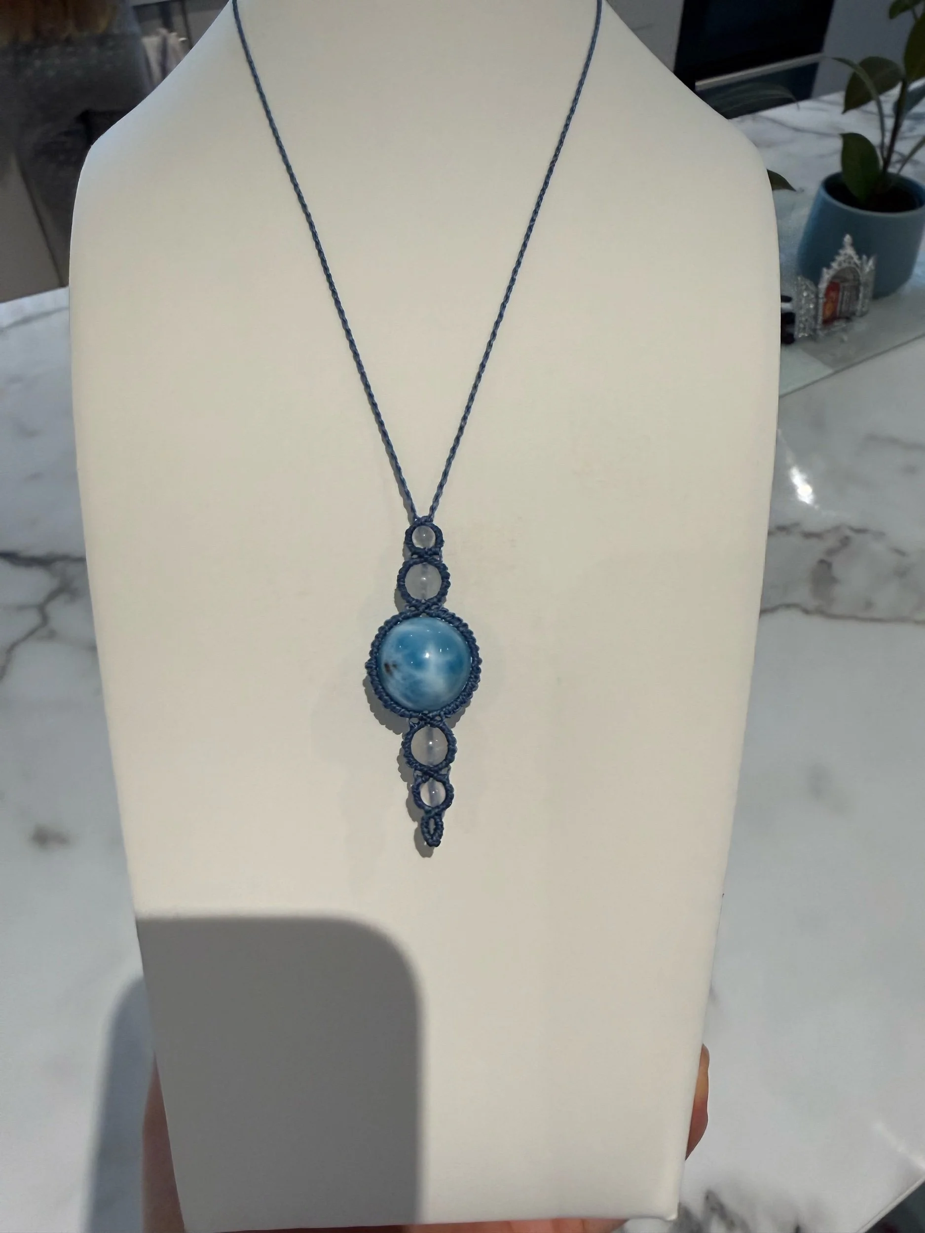 Crystals, gemstones, Larimar shop › Larimar macrame necklace Image 1 of 4 Image 2 of 4 Image 3 of 4 Image 4 of 4 Larimar macrame necklace €57.00 Larimar combined with moonstone and blue cord, adjustable length. Purchase Added! Larimar combined with moonstone and blue cord, adjustable length. Reviews Reviewer Name Review Date Star Rating Description Posted on Etsy Product Show More